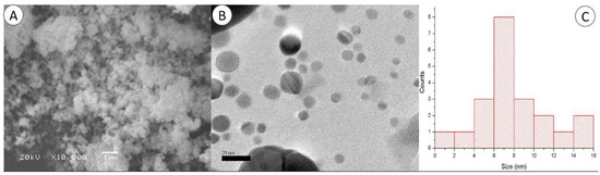 Scanning electron microscopy (A) and transmission electron microscopy (B) images of the synthesized AgNPs (Bar = 1 µm for SEM and 20 nm for TEM). Particle size distribution graph using TEM analysis (C).