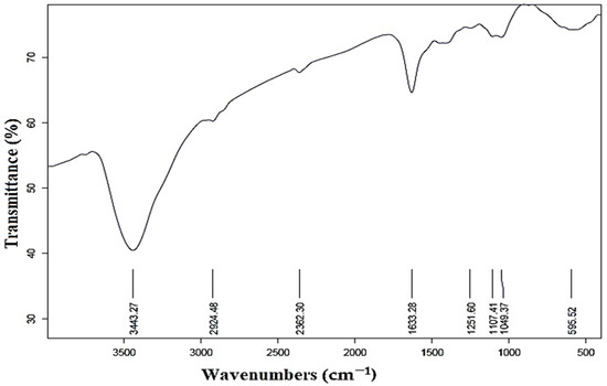 As illustrated in Figure 4, the FTIR spectrum reveals numerous functional groups in various locations. The peaks in the 3443 cm−1 and 2924 cm−1 were attributed to the aldehyde-C-H- and O-H-stretching of alcohol compounds [54,55]. The existence of C=O groups (aldehydes and ketones) in the produced AgNPs was confirmed by the peak at 2362 cm−1 [40]. Furthermore, the peak found at 1633 cm−1 demonstrated the carbonyl group’s (C=O) stretching vibration and the amine group’s N-H bending [55]. The spectral bands observed at the 1107 and 1049 wavenumbers were assigned to the stretching vibrations of the C-O bond, as reported in previous studies [56,57]. Furthermore, it is plausible that the peak observed at 595 cm−1 may be attributed to the stretching of C-N bonds in amine functional groups, as suggested by previous research [58]. This investigation demonstrates the contradictory behavior of molecules that may be involved in the stabilization and reduction of silver nanoparticles [59].