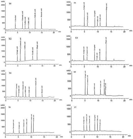 HPLC chromatograms of the identified phenolic compounds in leaf methanol extract from Asclepias curassavica. For the legends of T0–T11, see Table 7.
