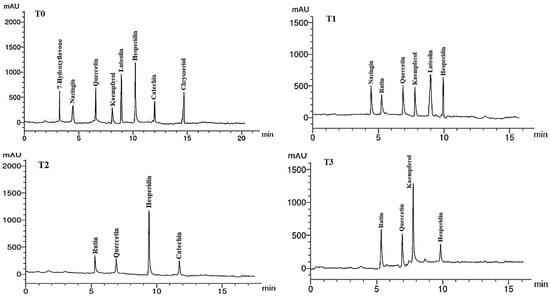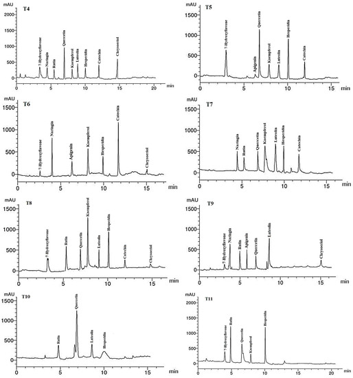 HPLC chromatograms of the identified flavonoid compounds in leaf methanol extracts from Asclepias curassavica. For the legends of T0–T11, see Table 7.