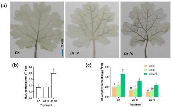 With 3,3′-diaminobenzidine (DAB) staining, reddish brown spots form due to the rapid reaction of H2O2 with DAB under catalase. The production of H2O2 was detected by observing the location and intensity of brown spots. The veins of the control plants were lightly stained, whereas the brown color of the leaf veins deepened significantly in the leaves of M. cordata under the Zn 7d conditions (Figure 2a). The concentrations of H2O2 in the leaves assayed using spectrophotometry were consistent with those of histochemical detection via DAB staining (Figure 2b). Therefore, oxidative stress in mesophyll cells increased after Zn treatment for 7 d. In addition, the contents of chlorophyll a and b in the leaves of M. cordata decreased significantly under the Zn treatment (Figure 2c).