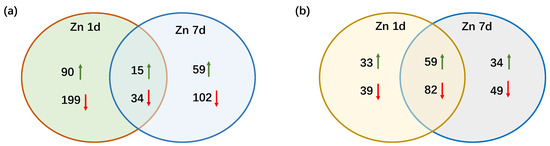Venn diagrams showing the numbers of (a) differentially expressed genes and (b) differentially expressed proteins in the leaves of Macleaya cordata. Upward green arrow shows an increase and the downward red arrow shows a decrease in the expression of genes or proteins in the leaves of M. cordata exposed to 200 μmol·L−1 Zn for 1 day (Zn 1d) or 7 days (Zn 7d).