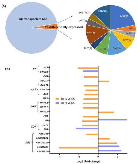A total of 555 non-redundant transporters were identified from the transcriptome of M. cordata leaves. Among the transporters, 24 transporter genes were identified as DEGs in the leaves of M. cordata under the Zn treatment (Figure 4a). The genes were mainly categorized into ATP-binding cassette transporters (ABC, 5 of 24), amino acid transporters (AAT, 3 of 24), nitrate transporters (NRT, 3 of 24), two tonoplast dicarboxylate transporters (TDT), two sugar transporters (ST), a phosphate transporter (PHT), a vacuolar iron transporter (VIT), a sulfate transporter (SULTR), an oligopeptide transporter (OPT) and three other transporters (Figure 4a). The expression change in the transporters under the Zn treatment was analyzed (Figure 4b). The Zn treatment downregulated 15 of the 20 transporters; however, four ABC transporter genes were upregulated in Zn 1d or 7d. Five transporter genes, including VIT, ABCI17X1, and ABXI17X3, were upregulated by the Zn 7d treatment. Significantly, both VIT and ABCI17X3 genes were downregulated in the Zn 1d treatment and were upregulated in the Zn 7 d treatment.