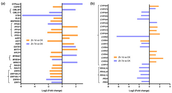 Twenty-eight DEGs were involved in signal transduction (Figure 5a), and eighteen appeared in the Zn 1d treatment. With the exception of the transcription factor of the MYB44 gene, which appeared in both Zn 1d and Zn 7d, 27 DEGs were upregulated in either the Zn 1d or Zn 7d conditions, and 19 of the 28 DEGs were downregulated by Zn. Among those DEGs, the expression of the serine/threonine protein kinase (STN) gene decreased the most, whereas GTPase increased the most, and both appeared in the Zn 7d treatment. Five genes, including GTPase, calcium-binding protein (CML), WRKY, MYB44, and GATA transcription factors, were upregulated in the Zn 7d treatment, and five other genes, including those for myelin (MYT1), bZIP, and iron deficiency response (FER) transcription factors and two phosphatases (PP37 and PP51), were upregulated in the Zn 1d treatment. Other DEGs involved in signal transduction were downregulated by the Zn treatment. Furthermore, 18 DEGs had at least an annotation for cytochrome P450 (CYP) from NCBI (nr), Swiss-port, GO, COG, KOG, or KEGG, and five pathogenesis-related protein (PRs) were downregulated in the Zn 7d treatment (Figure 5b).