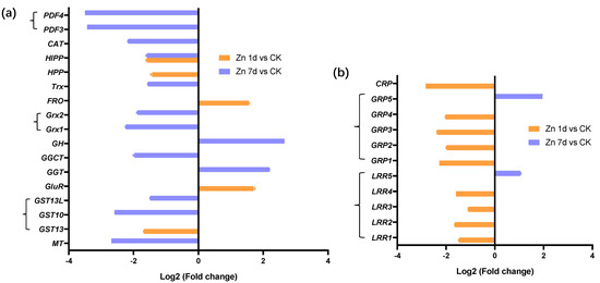Seventeen DEGs were involved in cysteine metabolism (Figure 6a), but only five DEGs appeared in the Zn 1d treatment. Among them, four DEGs were upregulated by Zn, and glutathione hydrolase (GH) was the most upregulated in the Zn 7d treatment. Two DEGs of defensin-like proteins (PDF3 and PDF4) were the most downregulated in the Zn 7d treatment. Metallothionein (MT) and glutathione S-transferase (GST10) were also most downregulated in the Zn 7d treatment. A heavy-metal-associated isoprenylated plant protein (HIPP) gene was downregulated in both the Zn 1d and 7d treatments. Eleven DEGs involved in cell wall structural proteins were downregulated in the Zn 1d treatment, and only leucine-rich repeat receptor protein kinase (LRR5) and a glycine-rich cell wall structural protein (GRP5) were upregulated in the Zn 7d treatment (Figure 6b).