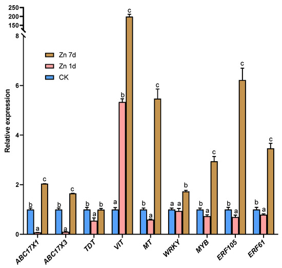 The expression of nine DEGs from the transcriptomic analysis was verified through the expression levels according to qRT-PCR. The relative expressions of ABC17X1, ABC17X3, TDT, WRKY, and MYB genes were consistent with the results of the transcriptome; however, VIT gene expression increased in the Zn 1d treatment according to qRT-PCR, in contrast to the results in the transcriptome (Figure 7). In addition, the relative gene expression of MT, ERF105, and ERF61 increased significantly in the Zn 7d treatment, which is in contrast to the results of the transcriptome.