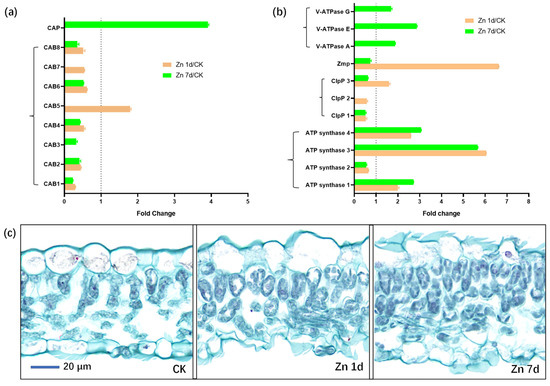 Eight DEPs were identified as chlorophyll a-b binding proteins (CABs), but only CAB5 was upregulated in the Zn 1d treatment (Figure 8a). Moreover, the chlorophyll apoprotein (CAP) gene was also upregulated in the Zn 7d treatment. Eleven DEPs were involved in ATP metabolism (Figure 8b), and three of the four ATP synthase genes were upregulated in both the Zn 1d and 7d treatments. However, three vacuolar-type ATPase (V-ATPase) genes were upregulated in the Zn 7d treatment, and the genes of an ATP-dependent Clp protease (ClpP3) and zinc metalloprotease (ZMP) were also upregulated in the Zn 1d treatment. The morphology of mesophyll cells was determined via paraffin sectioning with safranin and fast green staining (Figure 8c). Compared with the control, the number of mesophyll cells increased significantly under the Zn treatments, and the degree of increase was most pronounced in the Zn 7d treatment.
