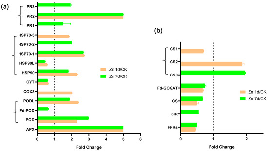 Fourteen DEPs were stress-response-related proteins, and most, including one APX, two of three PODs, three of the four heat shock proteins (HSPs), and three PRs, were upregulated by Zn (Figure 9a). Seven DEPs were involved in sulfur metabolism (Figure 9b), but only two glutamine synthetase genes (GS2 and GS3) were upregulated by Zn. However, ferredoxin–NADP reductase (FNR), sulfite reductase (SiR), cysteine synthase (CS), ferredoxin-dependent glutamate synthase (Fd-GOGAT), and GS1 were downregulated by Zn.