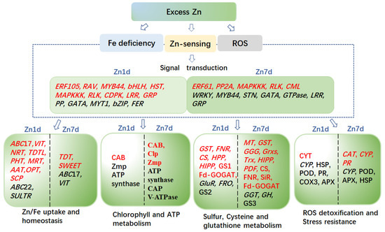 Macleaya cordata has a high tolerance to Zn [19,20,21]. In this study, ten of twenty-four genes associated with signal transduction were upregulated in the leaves by Zn. The DEGs of MYT, FER, bZIP, and two PPs were upregulated in the Zn 1d treatment, whereas the DEGs of WRKY, MYB44, GATA, CML, and GTPase were upregulated in the Zn 7d treatment (Figure 5a). In addition, 19 genes involved in signal pathways were downregulated in the Zn 1d or Zn 7d treatments. The WRKY transcription factors have a novel Zn-chelating DNA-binding domain, and several WRKYs are upregulated in response to the H2O2 treatment in A. thaliana [39]. In Pepper, WRKYs are also upregulated by Cd and H2O2 stress [40], and the overexpression of ThWRKY improves the Cd tolerance of Saccharomyces cerevisiae [40,41]. In this study, STN was downregulated almost six times in the Zn 7d treatment (Figure 5a). In rice, the loss-of-function of OsSTN8 suppresses photosystem II phosphorylation [42]. Therefore, there were multiple signal pathways that regulated transport or antioxidant protection during the Zn treatment.