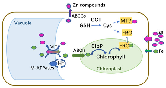 Most Zn transporters are involved in iron (Fe) transport. For example, in Arabidopsis, iron-regulated transporter 1 and ZIP family transporters are responsible for Fe and Zn uptake [9,10]. Therefore, the cellular utilization of Fe decreases when Zn is in excess, and plants exhibit symptoms of Fe starvation [11]. Excess Zn depressed the activities of Rubisco and PSII in Arabidopsis, which showed symptoms of Fe deficiency [10]. Plants also possess homeostatic mechanisms to compartmentalize heavy metals in different plant tissues to minimize damage [11,12].