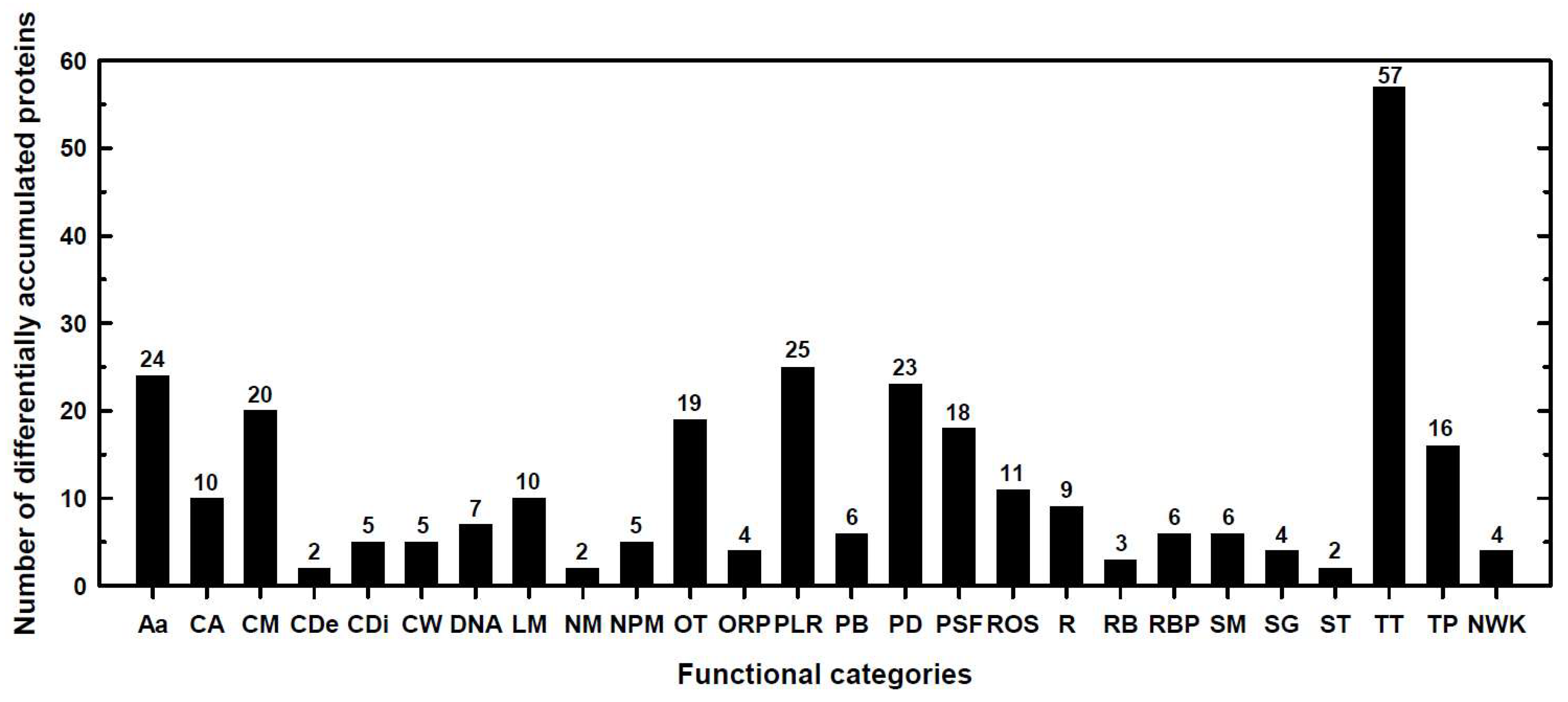 All significant differentially expressed proteins in the four comparison groups described above were functionally classified into 26 categories using several databases (Table S2). The functional categories that included the largest number of differentially accumulated proteins were transcription and translation processes (57), photosynthesis (25), amino acid metabolism (24), protein degradation (23), carbohydrate metabolism (20), and protein stabilization and folding (18) (Figure 2 and Table S2). These main categories together contained more than 50% of the total differentially expressed proteins.