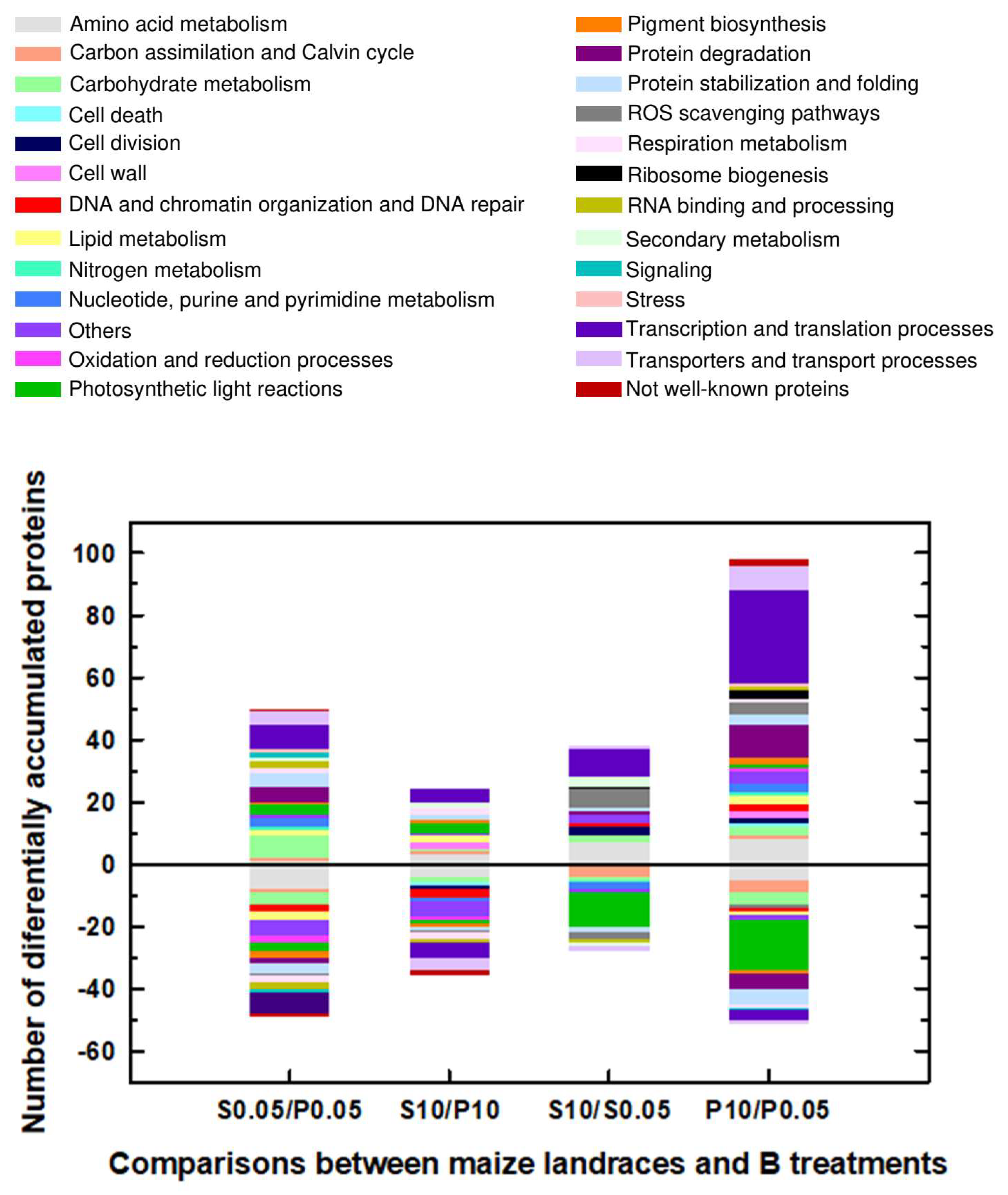 2.1. Classification into Several Functional Categories of Differentially Accumulated Proteins in Both Maize Landraces and B Treatments