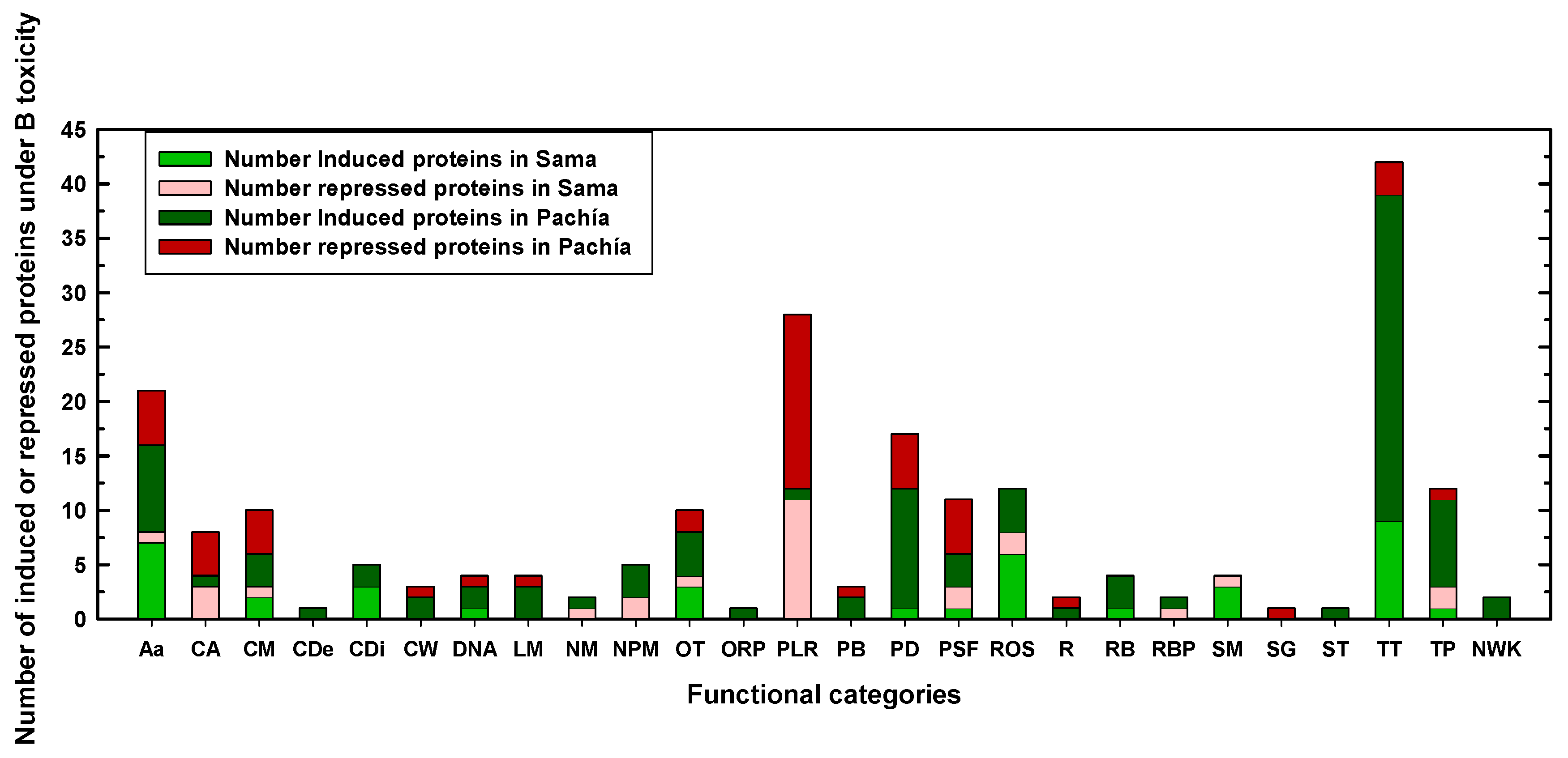 Considering that the major aim of this work was to analyze the changes induced by B toxicity in protein expression in Pachía and Sama, we will now focus on the proteins that were differentially expressed due to B toxicity in these landraces. Thus, 66 and 149 proteins were differentially expressed in response to B toxicity in Sama and Pachía, respectively (Table 1). The main functional categories containing the highest number of differentially expressed proteins under B toxicity in both Sama and Pachía were transcription and translation, photosynthesis, amino acid metabolism, protein degradation, protein stabilization and folding, and reactive oxygen species (ROS) (Figure 3 and Figure 4). Interestingly, most of the proteins belonging to the transcription and translation category were induced in response to B toxicity in both Sama and Pachía, with the number of differentially induced proteins being remarkably higher in Pachía (Figure 3 and Figure 4). However, almost all proteins included in the photosynthesis category were repressed in 10 mM B, with the number of down-accumulated proteins also being higher in Pachía than in Sama (Figure 4 and Table S2). Regarding protein degradation, and protein stabilization and folding, most of the differentially expressed proteins in 10 mM B were found in Pachía, suggesting that B toxicity would alter the structure and folding of proteins in this landrace. In addition, many of the proteins in the ROS category were induced by B toxicity in both landraces (Figure 4 and Table S2). Although the groups of carbon assimilation and metabolism, lipid metabolism, and respiration included a smaller number of proteins than those mentioned above, a larger number of differentially expressed proteins were found in Pachía under B toxicity (Figure 4 and Table S2). Other interesting categories were cell death, cell division, cell wall, ribosome biogenesis, and RNA binding and processing, which, despite having a very small number of proteins regulated by B toxicity, had an interesting distribution in both landraces and B treatments. In fact, in the cell death and cell wall categories, only proteins whose expressions were induced by B toxicity were found in Pachía; however, the cell division, ribosome biogenesis, and RNA binding and processing categories also contained proteins with higher accumulation in 10 mM B in both landraces (Figure 4 and Table S2).