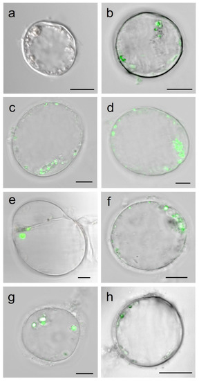 Cell suspension cultures of A. thaliana treated with 30 nm NPs and observed with a confocal microscope at different times ((a) 0 min; (b) 10 min; (c) 30 min; (d) 1 h; (e) 2 h; (f) 24 h). Fluorescence is localized within spherical bodies. (g,h) A. thaliana suspended cells observed by confocal microscopy after treatment with dynasore at 80 µM (g) or 160 µM (h) for 10 min before the addition of 15 mg L−1 NPs. Fluorescence in both cytoplasm and vesicles is still visible. Merged (bright field/fluorescence) images are shown. The scale bars represent 10 µm.