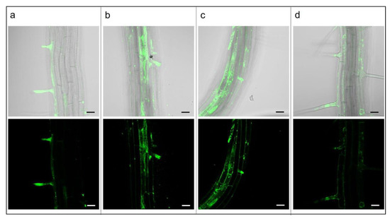 A. thaliana plantlet roots treated with 30 nm NPs (15 mg L−1) and observed by confocal microscopy at different times of Cu6-PLGA NPs treatment (10, 30, 80 min, and 5 h). Merged (bright field/fluorescence) and fluorescence images are shown. (a) A. thaliana root treated for 10 min with Cu6-PLGA NPs. Cu6-PLGA NPs penetrated through the root hairs; (b) A. thaliana root treated for 30 min with Cu6-PLGA NPs; (c) A. thaliana root treated for 80 min with Cu6-PLGA NPs. Cu6-PLGA NPs were not only visible in root hairs but in almost all cells of the epidermis. (d) A. thaliana roots treated for 5 h with Cu6-PLGA NPs. Cu6-PLGA NPs penetrated into the root epidermis through the root hairs and remained at the level of the epidermis. The scale bars represent 20 µm.