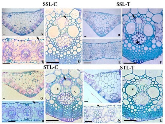 Transverse sections showing (A–I) anatomical characteristics in the leaf of control (SS and ST) and sodium-chloride-treated (SSN and STN) samples of sorghum plants. SS leaf tissue (SSL) (A–E) shows a relatively thin wall of epidermal cells (B) and thin and less lignified vessel elements (C) (arrow). Accumulation of polysaccharides was noticed in the cell corners of phloem elements within the vascular bundles. ST leaf (STL) (G–L) shows thicker cell wall in the epidermis (H) (arrow) and more lignified vessel walls (I). The increase in thickness of the upper cell wall of epidermis (K) (arrow) and thick-walled and highly lignified cell wall of vessel elements remain intact (L) in STN leaf. Scale bar = 50 µm. SS = salt-susceptible genotype ICSR-56; ST = salt-tolerant genotype CSV-15; SSN = salt-susceptible plants grown under sodium chloride stress; STN = salt-tolerant plants grown under sodium chloride stress; SSL-C = salt-susceptible leaf grown under control (without salt stress); SSL-T = salt-susceptible leaf grown under 200 mM sodium chloride stress conditions; STL-C = salt-tolerant leaf grown under control (without salt stress); STL-T = salt-tolerant leaf grown under 200 mM sodium chloride stress conditions; V = vacuole.