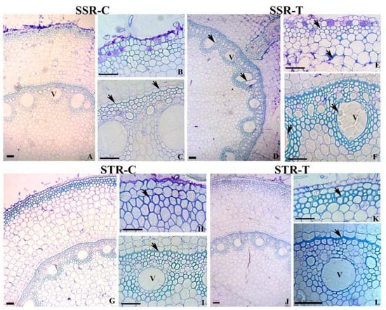 Root anatomy has been compared between SS root control (abbreviated as SSR-C), SS root treated with 200 mM sodium chloride (SSR-T), ST root control (STR-C), and ST root treated with 200 mM sodium chloride (STR-T). In comparison with the SS roots (Figure 2A,B), roots of ST plants showed an increase in the number of cell layers with thick, lignified walls constituting the hypodermis (Figure 2G,H). The characteristic wall thickening on the endodermis was also higher in ST roots (Figure 2I). The SS plants were characterized by metaxylem elements with thin cell walls and a large lumen diameter (Figure 2C) compared to relatively thick-walled narrow-lumen xylem elements in ST roots (Figure 2I). Cuticles are thin in SS plants in comparison with ST plants. After salt treatment, STN plants displayed an increase in lignified cell walls of the hypodermis (Figure 2J,H) while SSN plants did not exhibit any variation in cell wall structure of the hypodermis (Figure 2D,E). The cell corner region of cortical cells often showed accumulation of polysaccharides in STN (Figure 2D). In both SSN and STN plants, salinity stress exhibited an increase in the thickness of lower tangential and radial walls with Casparian strips in the endodermis (Figure 2F,L). The ST roots were distinguished by a greater amount of lignin in the thickened wall areas. The SS root, on the other hand, was characterized by the occurrence of tylosis in the metaxylem elements (Figure 2F). The large lumen metaxylem elements with thin cell walls often deformed and collapsed following salt treatment in the SS genotype (Figure 2D). Vascular bundles exhibit a large lumen diameter with thin cell walls in SS, compared to thick-walled elements in ST.