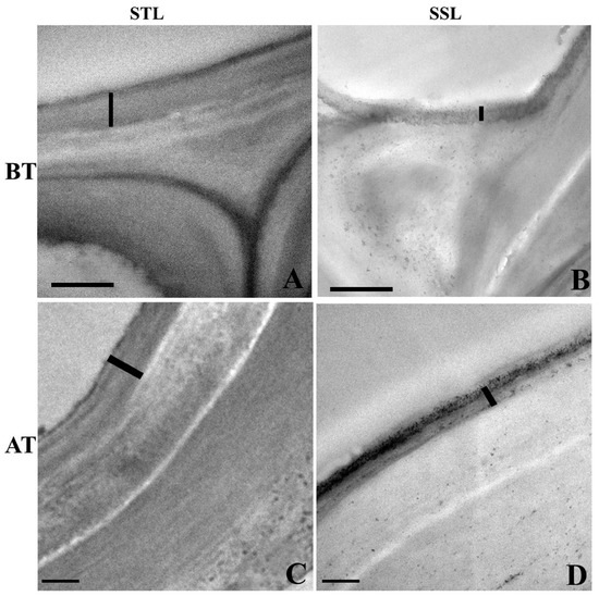 Transmission electron microscopy (TEM) images from the transverse sections of the upper epidermal cells from salt-tolerant leaf (STL) and salt-susceptible leaf (SSL) of Sorghum bicolor before treatment with sodium chloride (BT) and after treatment with sodium chloride (AT). (A) Salt-tolerant leaf showing a thick cuticle on the upper epidermal cell. (B) Relatively thinner cuticles are seen in the salt-susceptible leaf. (C) The cuticle of STL shows an increase in thickness of cuticle after salt treatment. (D) Thin cuticle in the SSL after salt treatment. Vertical bar indicates the cuticle thickness. Scale bar = 2 µm. SSL = salt-susceptible leaf; STL = salt-tolerant leaf.