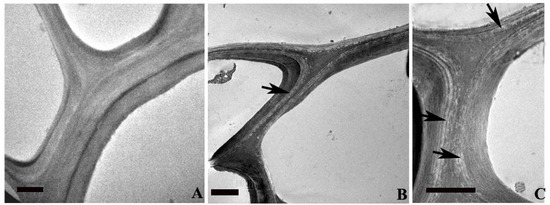 Transmission electron microscopy (TEM) images from the transverse sections from the vessel cell wall in the root tissue of salt-tolerant (A) and salt-susceptible (B,C) plant of Sorghum bicolor. (A) The thick cell wall of vessels from salt-tolerant root shows more or less homogenous lignin distribution. Note the high lignin distribution in the sub layer of S2 wall layer. (B) The thin wall of the vessel in the salt-susceptible root (SSR) shows less lignin distribution in the secondary wall layers. (C) Vessel wall of SSR is showing sub layers with inhomogeneous lignin distribution within S1 and S2 wall layers (arrows). Scale bar = 2 µm.