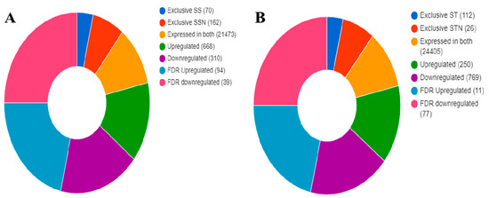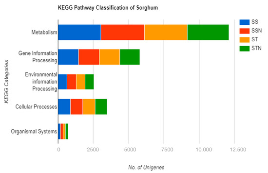 Paired-end reads used for reference-based read mapping are shown in Supplementary Table S1. The transcriptomic data obtained for SS, SSN, ST, and STN treatments are represented in Supplementary Files S2 and S3, respectively. Significant DEGs associated with SS/SSN (Figure 7A) and ST/STN (F Figure 7B) pairs were identified across the inferred datasets. Seventy genes are exclusive to SS: 162 for SSN, in contrast to 112 and 26 for ST and STN, respectively. Likewise, 668 and 250 have been found to be upregulated, while 310 and 769 are downregulated in SS and ST genotypes (Figure 7A,B). In SS/SSN genotypes, 21,473 genes were expressed, and 24,405 in ST/STN (Figure 7A,B). The KEGG revealed diverse pathway genes associated with carbohydrate, energy, lipid, nucleotide, amino acid, metabolism of cofactors and vitamins, terpenoids, polyketides, and secondary metabolism in SS, SSN, ST, and STN samples (Figure 8). Likewise, genes involved in gene information processing; environmental information processing, including signal transduction’ cellular processes’ and organismal systems have been detected (Figure 8). GO analysis disclosed the genes implicated in biological processes, cellular components, and molecular function (Figure 8). The striking difference is that a higher number of genes have been found downregulated in the ST genotype in comparison with SS. The difference is pronounced in all the areas including biological processes (83 vs. 299), cellular components (81 vs. 321), and molecular function (118 vs. 343) in SS vis à vis ST genotypes (Table 1).