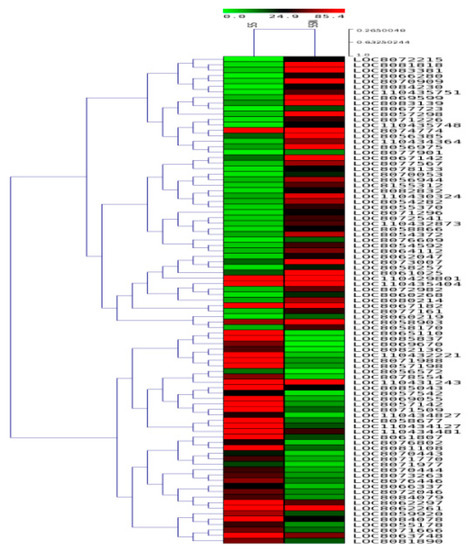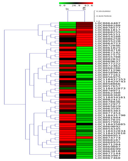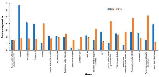 In order to functionally utilize the transcriptome data obtained, selected gene expressions (20 genes for each genotype) were validated via qRT-PCR analysis for both SS and ST genotypes, respectively (Table 2). While SS values were used as controls against SSN, ST values were taken as controls for deriving STN values. Expression studies of all the 20 genes (Table 2) were carried out in SS and ST sorghum leaves subjected to salt treatment for 24 h and shown as a heat map (Figure 9 and Figure 10). Differential expression profiles of genes (Table 2) have been observed in SS and ST under sodium chloride treatment. All the genes (Table 2) displayed higher expression levels in ST under sodium chloride treatment (Figure 11). Similarly, all the genes (Table 2) displayed higher expression levels in SS under sodium chloride treatment except Lipid transfer protein (LTP), non-coding RNA (miRf11471-akr), and Fasiclin-like arabinogalactan protein 12 genes, which are downregulated (Figure 11).