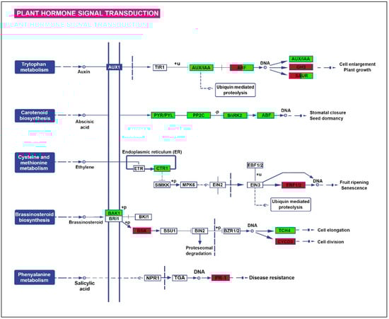 KEGG diagram of plant hormone signal transduction in Ilex paraguariensis root subjected to a severe drought stress (Ψsoil = −2 MPa) episode. Green and red indicate increased and decreased expression (FC ≥ 2, FDR < 0.001).