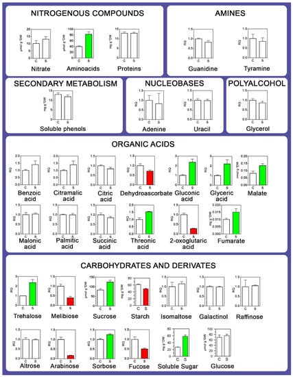 Metabolomic profile of I. paraguariensis roots subjected to a severe drought stress (Ψsoil = −2 MPa) episode. Bars represent the mean of three biological replicates ± SD. Values are expressed in absolute or relative terms. Bars with different colours indicate variation in the content of biological compounds between treatments (t-test, p < 0.05). Red and green indicate lower and higher levels than the well-watered control. The white colour indicates no variation. C, non-stressed (Ψsoil ~ −0.04 Mpa); S, stressed (Ψsoil = −2 Mpa) plants. RQ, relative quantity.