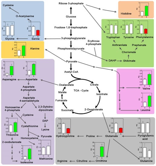 Schematic diagram of drought-induced changes in the I. paraguariensis root amino acid metabolism. Bars represent the mean of three biological replicates ± SD. Values are expressed in relative terms to control plant level. Bars with different colours indicate variation in the content of biological compounds between treatments (t-test, p < 0.05). Red and green indicate lower and higher levels than the well-watered control. White colour shows a non-significant difference concerning the well-watered conditions. C, non-stressed (Ψsoil ~ −0.04 MPa); S, stressed (Ψsoil = −2 MPa) plants. RQ, relative quantity.