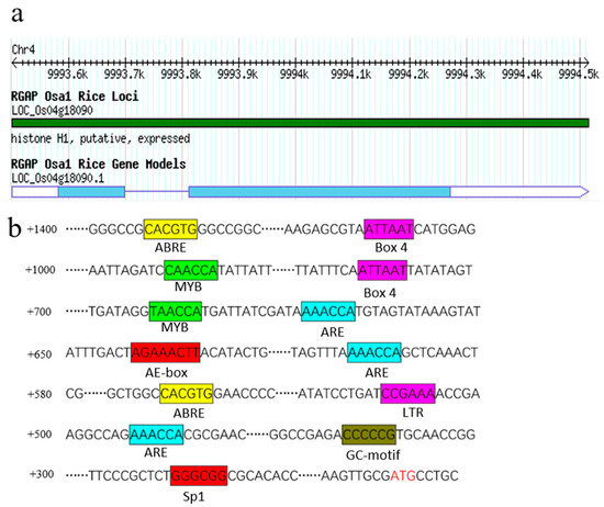 OsHis1.1 sequence analysis. (a) OsHis1.1 gene’s information. (b) Analysis of elements associated with the OsHis1.1 promoter region.