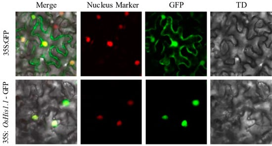The subcellular location of OsHis1.1 was experimentally verified via the transient transformation of CaMV35S-OsHis1.1-GFP in tobacco leaves. The green fluorescence signals of the green fluorescent protein (GFP) control were observed in the cell nucleus and the plasma membrane of the tobacco leaf, whereas the green fluorescence signals of the OsHis1.1:GFP fusion were only observed in the nucleus (Figure 2). The results showed that the OsHis1.1 protein was located in the nucleus.