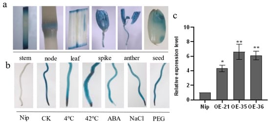 To examine the expression pattern of OsHis1.1, the activity of β-glucuronidase (GUS) in OsHis1.1 promoter-GUS transgenic rice plants was analyzed; the histochemical staining for GUS activity in various tissues was performed (Figure 3a); and strong GUS signals were observed in the stems (nodes and internodes), leaves, spikes, anthers and seeds. After exposing OsHis1.1 promoter-GUS transgenic seedlings to different stress treatments, the GUS signal detected in the treatment group was significantly weaker than that in the control group (Figure 3b), further indicating that OsHis1.1 may be involved in multiple stress responses.