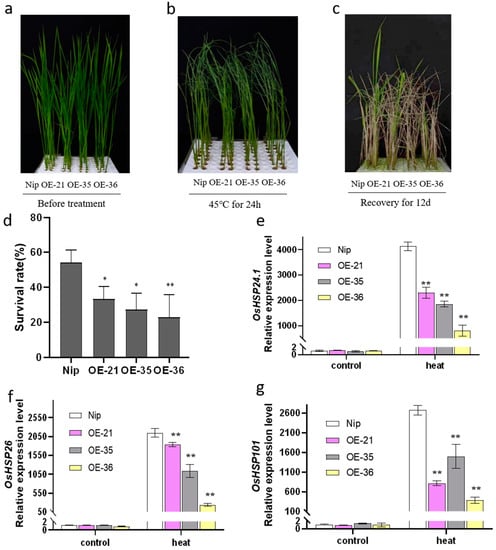 In order to select overexpressed lines for subsequent experiments, a batch of rice lines was obtained through PCR detection and hygromycin selection (Figure S1). Then, the expression level of OsHis1.1 was detected via RT-PCR (Figure 3c). We finally selected three overexpression rice lines (OE-21, OE-35 and OE-36). To verify the response of OsHis1.1-overexpression rice (OsHis1.1-OE) to heat stress, we cultured Nip and three overexpression lines (OE-21, OE-35 and OE-36) under normal conditions for 14 days (14 d) and then treated them at 45 °C for 1 d, and finally, we transferred the seedlings to normal conditions for 12 d (Figure 4a–c). The results showed that under normal conditions, the growth status of OsHis1.1-OE and Nip (wide-type rice) seedlings was almost the same, but after high-temperature treatment, the survival rate of OsHis1.1-OE seedlings was significantly lower than that of Nip (Figure 4d).