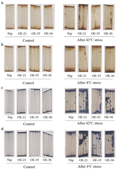To investigate the effect of the overexpression of OsHis1.1 on ROS accumulation, 14-day-old Nip, OE-21, OE-35 and OE-36 seedlings were subjected to heat and cold stress, and the accumulation of superoxide anion (O2−) and hydrogen peroxide (H2O2) was evaluated via Nitrotetrazolium Blue Chloride (NBT) and Diaminoaniline (DAB) staining, respectively. Under normal conditions, there were no obvious differences between the Nip and OsHis1.1-OE rice lines. After the cold and heat treatments, the results of NBT and DAB staining revealed that leaves of Nip accumulated less O2− and H2O2 than OsHis1.1-OE lines (Figure 6a–d), which was reflected by less severe surface spots and browning surfaces in leaves of Nip (Figure 6a–d).
