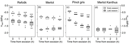 Testing time from leaf sampling to water potential measurements in (a) Refošk; (b) Merlot; (c) Pinot gris; (d) Merlot Kanthus® grapevine cultivars. Median values, 25th and 75th percentiles of leaf minimum water potentials (Ψleaf) measured at different timings from leaf excision in the early season (end May 2020) and in the late season (end August–beginning of September 2020/2021). Asterisks indicate significant differences between Ψleaf at 0 h (control) and the other storage times (* 0.01 < p < 0.05, ** 0.001 < p < 0.01, *** 0.001 > p; n = 5). Dots indicate outliers.