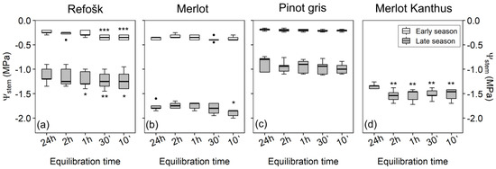 Testing equilibration time for stem minimum water potential (Ψstem) measurements in (a) ‘Refošk’; (b) ‘Merlot’; (c) ‘Pinot gris’; (d) ‘Merlot Kanthus®’ grapevine cultivars. Median values, 25th and 75th percentiles of Ψstem measured in grapevine leaves with different equilibration times in the early season (end May 2020) and in the late season (end August–beginning of September 2020/2021). Asterisks indicate significant differences between Ψstem measured for 24 h equilibrated leaves (control) and the other storage times (* 0.01 < p < 0.05, ** 0.001 < p < 0.01, *** 0.001 > p; n = 5). Dots are outliers.