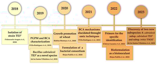 Bacillus cabrialesii TE3T is an endophytic plant growth-promoting bacteria (PGPB) and biological control agent (BCA) with great agrobiotechnological potential which was isolated in 2018 from wheat plants in the Yaqui Valley, Mexico, by our research team [12,13]. Since that year, this novel bacterial taxon has been extensively studied due to several traits that make it well-suited for use in agriculture, including its mechanisms of action against phytopathogens and promotion of plant growth, as well as its potential to be used in the microbial inoculant bioformulation to be applied in several crops (Figure 1). Currently, this strain is cryopreserved in the Culture Collection of Native Endophytic and Soil Microorganisms (COLMENA, www.itson.mx/COLMENA, accessed on 21 June 2023), which is dedicated to the preservation of microorganisms as a soil conservation strategy, through the isolation, safeguarding, characterization, and typification of cultivable soil microbial resources [4].