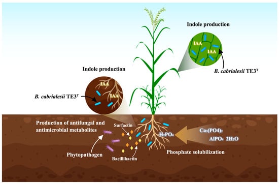 Summary of promising biological functions of B. cabrialesii TE3T on the interaction with plants and phytopathogens.
