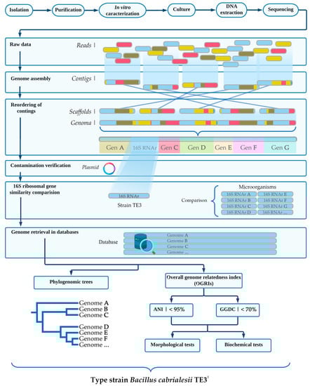 As mentioned before, Valenzuela-Aragón et al. (2018) [14] suggested that strain TE3T belongs to the genus Bacillus, based on their sequencing of the full-length 16S rRNA gene, and months later, Villa-Rodriguez et al. (2019) [12] proposed its taxonomic affiliation to Bacillus subtilis. However, to define its taxonomical affiliation, a polyphasic characterization was used (Figure 3), for which the genome of strain TE3T was sequenced using Illumina Sequencing by Synthesis (SBS) technology. Then, by using the EzTaxonserver and BLAST tools, the 16S rRNA gene sequence of strain TE3T showed high similarity (100%) to Bacillus subtilis subsp. Inaquosorum. However, it is known that close relative strains of Bacillus are not reliably taxonomically distinguished only by their 16S rRNA gene sequences, but this analysis confirms its belonging to this genus [19,20]. Later, by using average nucleotide identity (ANI) analysis, strain TE3T showed a maximum average value of 93.8% with B. subtilis subsp. Inaquosorum, followed by B. subtilis subsp. Spizizenii (93.6%), B. tequilensis (93.4%), and B. subtilis subsp. subtilis (92.3%), and using the Genome-to-Genome Distance Calculator (GGDC), the distances among genomes of strain TE3T and closely related Bacillus species were below 70%. Based on these genomic analyses, strain TE3T was distinguished as a novel species of the genus Bacillus, named Bacillus cabrialesii [21]. This novel species was named in honor of Dr. Juan Jose Peña Cabriales, a Mexican microbiologist who pioneered many investigations into plant-associated microorganisms and soil microbial ecology.