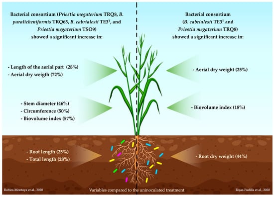 Increment of wheat biometric traits by the consortium composed of Priestia megaterium TRQ8, B. paralicheniformis TRQ65, B. cabrialesii TE3T, and Priestia megaterium TSO9 on the left-hand side; and increases in wheat biometric traits by the consortium of Priestia megaterium TRQ8 and B. cabrialesii TE3T on the right-hand side [22,23].