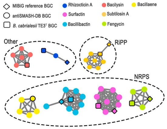 Genome mining analysis of Bacillus cabrialesii TE3T. Biosynthetic gene clusters (BGC) regions identified by antiSMASH in the genome of strain TE3T [13].