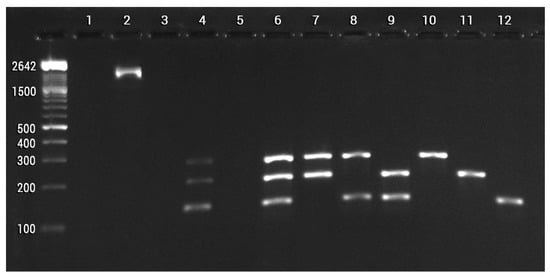 A total of 1.5% agarose gel electrophoresis using SB buffer and DNA Molecular Weight Marker XIV, showing amplifications of the 16S ribosomal gene using non-enriched soil DNA (lane 1: control; lane 2: DNA soil), and multiplex PCR amplifications with the primer sets TE3T_1218_F and TE3T_1218_R, TRQ8_1083_F, and TRQ8_1083_R, and TRQ65_6857_F and TRQ65_6857_R using different template DNA (lane 3: control; lane 4: enriched soil; lane 5: non-enriched soil; lane 6: TE3T, TRQ8 and TRQ65; lane 7: TE8 and TRQ65; lane 8: TE3T and TRQ65; lane 9: TE3T and TRQ8; lane 10: TRQ65; lane 11: TRQ8; and lane 12: TE3T). Modified from Chávez-Luzania et al. [24].