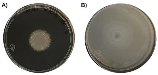 Growth differences between subspecies of B. cabrialesii cultured on Petri dishes containing Luria-Bertani broth supplemented with 0.7% bacteriologic agar: (A) B. cabrialesii subsp. cabrialesii TE3T (swarming morphology presents radial strokes); (B) B. cabrialesii subsp. tritici TSO2T (swarming morphology is shown as a featureless mat). Modified from de los Santos-Villalobos et al. [30].
