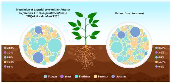 Finally, a study that aims to identify the modulation of the edaphic microbiome in the Yaqui Valley, Mexico, by the application of three bioinoculants based on bacterial consortium in crops, is being carried out. The composition of the bacterial inoculants was based on eight beneficial native strains, including B. cabrialesii subsp. cabrialesii TE3T and subsp. tritici TSO2T, B. paralicheniformis TRQ65, Bacillus sp. FSQ1 and TE5, B. subtilis TSO22, and Priestia megaterium TRQ8 and TSO9. Soil samples were collected from the rhizosphere of four commercial crops (jalapeno pepper, chickpea, corn, and summer corn) and two experimental crops of winter wheat and heat-stressed wheat (late planting), with and without the application of the bioinoculants, at different phenological stages. The soil samples were analyzed for identifying meta-taxonomic changes by sequencing the 16S rRNA genes for prokaryotes and ITS1 and ITS2 for eukaryotes using the Illumina Miseq platform. Results point to a marked modulation of fungal diversity in each of the studied crops and the phenological stage; otherwise, the bacterial diversity presents a homogeneous composition in all crops. Although robust statistical and ecological analyses are still underway, these results reinforce what has already been reported by other researchers and collaborators on the antifungal capacities of these bacterial strains (Figure 11) [40].