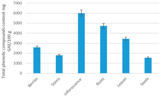 The total phenol content of the raspberry’s different parts ranged from 6500 mg GAE/100 g DW to 1700 mg GAE/100 g DW (Table 1 and Figure 1). The inflorescence had a considerably highest total phenol content. The high value was also detected in berries, and was 26% higher than that detected for the lowest value in the seeds. The amount of ascorbic acid content ranged from 60 to 140 mg/100 g of dry weight. The concentration of total phenol quantified in raspberry parts was higher than other scientists have determined [32]. These differences could be due to cultivation principles, environmental characteristics, and soil characteristics.