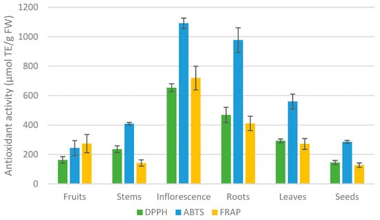 The antioxidant activity of the raspberry plant’s different morphological parts was evaluated by using ABTS, DPPH, and FRAP assays. Values were expressed as means with standard deviation error bars.