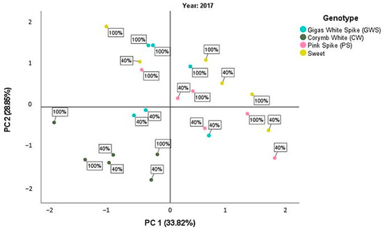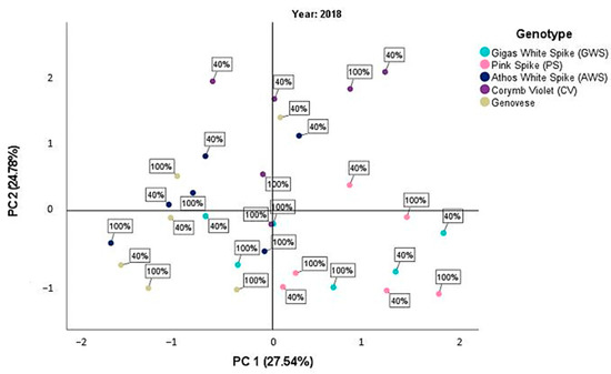In the second year (Figure 2), there was greater dispersion between the values of the two irrigation treatments and the genotypes used, particularly across the two components of PCA. Corymb Violet exhibited higher mean values for both water treatments and all measured plant characteristics. Genovese and Gigas White Spike, on the other hand, displayed negative mean values, especially along the second component representing physiological characteristics.