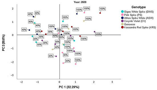 During the third year (Figure 3), although the mean values were closer to the origin of the axes compared to the other two years, all genotypes were negatively affected by water deficit, particularly in terms of morphological characteristics such as plant height and leaf area index. Athos White Spike, Corymb Violet, and Gigas White Spike showed the most significant reduction under water-stressed conditions, with negative mean values along both components. Kassandra Red Spike exhibited positive values, especially along the second component representing physiological characteristics. Pink Spike displayed positive values along the first component related to morphological parameters, even under d40 irrigation treatment. Genovese exhibited high dispersion along the axes, sometimes showing positive and sometimes negative values.