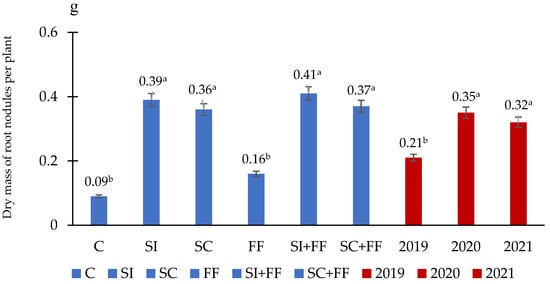 Dry mass of root nodules per plant. C—control (without inoculant and foliar fertilization), SI—seeds inoculated before sowing, SC—commercially coated seeds—Fix Fertig technology, FF—foliar fertilization with molybdenum, SI + FF, SC + FF. Different letters in the same column indicate significant differences (p < 0.05) according to the analysis of variance (ANOVA).
