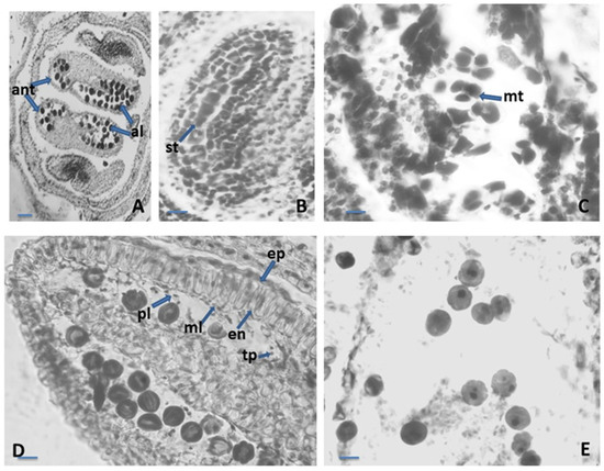 Anther and development of the male gametophyte. (A)—tetrasporangiate anther; (B)—sporogenous tissue in the anther locule; (C)—microspore tetrads in the anther locule; (D)—one-nucleate pollen grains and anther wall with epidermis, endothecium, middle layer and tapetum forming placentoids; (E)—two-celled mature pollen grains, ant—anther, al—anther locule, st—sporogenous tissue, mt—microspore tetrad, ep—epidermis, en—endothecium, ml—middle layer, tp- tapetum, pl—placentoid. Scale bar: for (A) = 50 μm; for (B–E) = 20 μm.