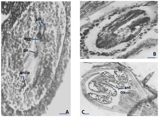 Ovule and development of the female gametophyte. (A)—Mature Polygonum-type embryo sac (ES); (B)—Embryo with cotyledons in ES cavity; (C)—Proterandry in the Satureja flower; syn—synergids, eggc—egg cell, pn—polar nucleus cell, antip—antipodal, ov—ovule, ant—anther locule; Scale bar: for (A,B) = 20 μm; for (C) = 50 μm.